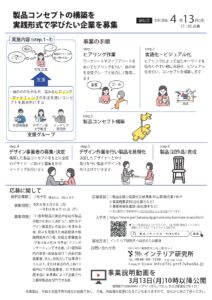 自社の基幹製品の創出や製品企画力の向上にあたってデザイナーとの出会いを求めるもの。その他条件については募集要項をご参照ください。